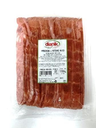 Μπέικον κομμένο σε φέτες, από επιλεγμένα κομμάτια χοιρινού κρέατος. Έντονο κάπνισμα και πλούσια γεύση. Πάντα με την εγγύηση και την ποιότητα της Dianik. Για επαγγελματική χρήση.